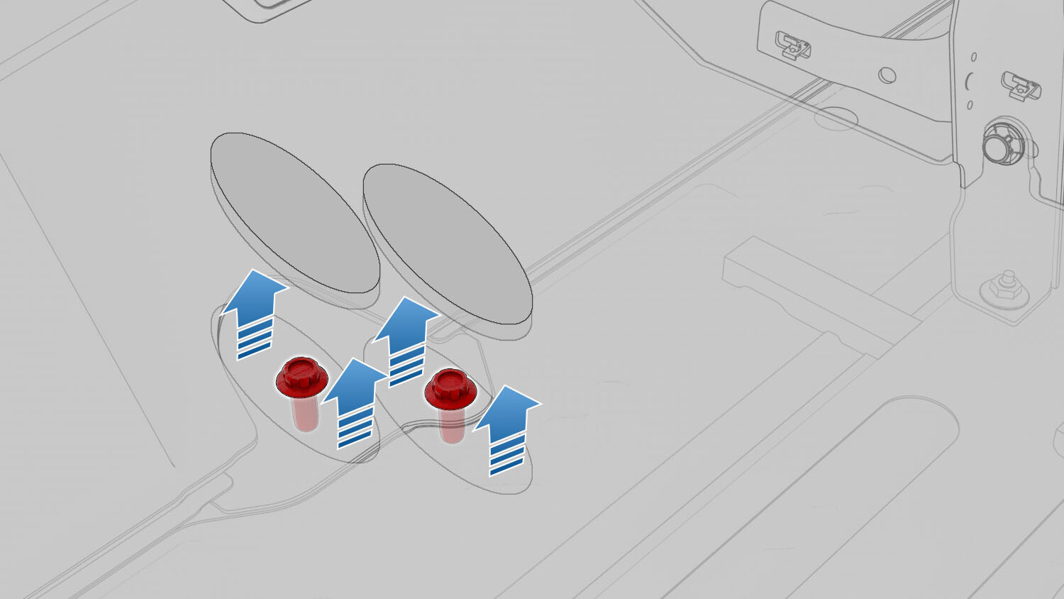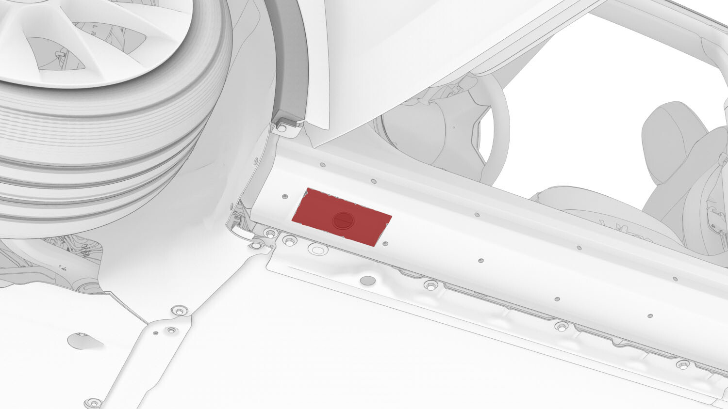 提起右前座椅下方地毯翻帘,然后拆下将高压电池固定到车辆的高压电池内部右侧中间螺栓。重复此步骤,完成车辆左侧相关操作。