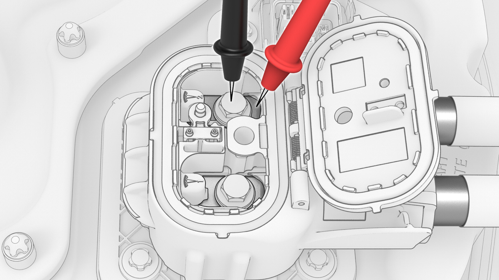 在高压电池仓处,使用 Hioki 电阻计测量充电接口母排引线与高压电池仓高压接头螺栓头之间的电阻。另请对其他引线和螺栓头执行该测试。