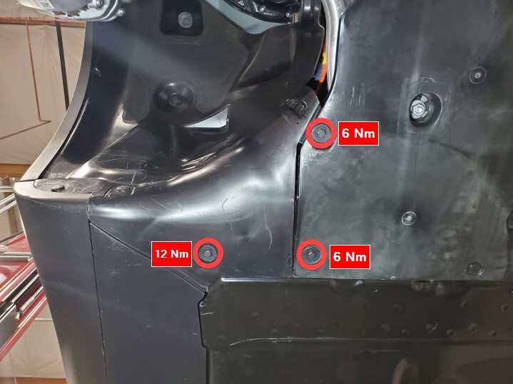 bolts, and then fasten the bolts that attach the RH front wheel liner to the HV battery.