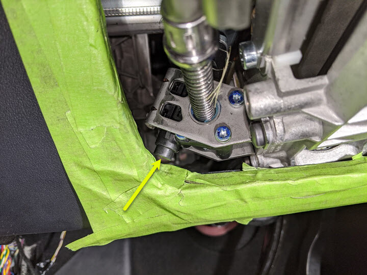 - 在协助下,朝车顶方向升起转向柱上部,将转向柱下方的仪表板支架向下拉动,留出空间,以使转向柱后电机从横梁下方通过,然后朝车尾方向小心地移出转向柱。