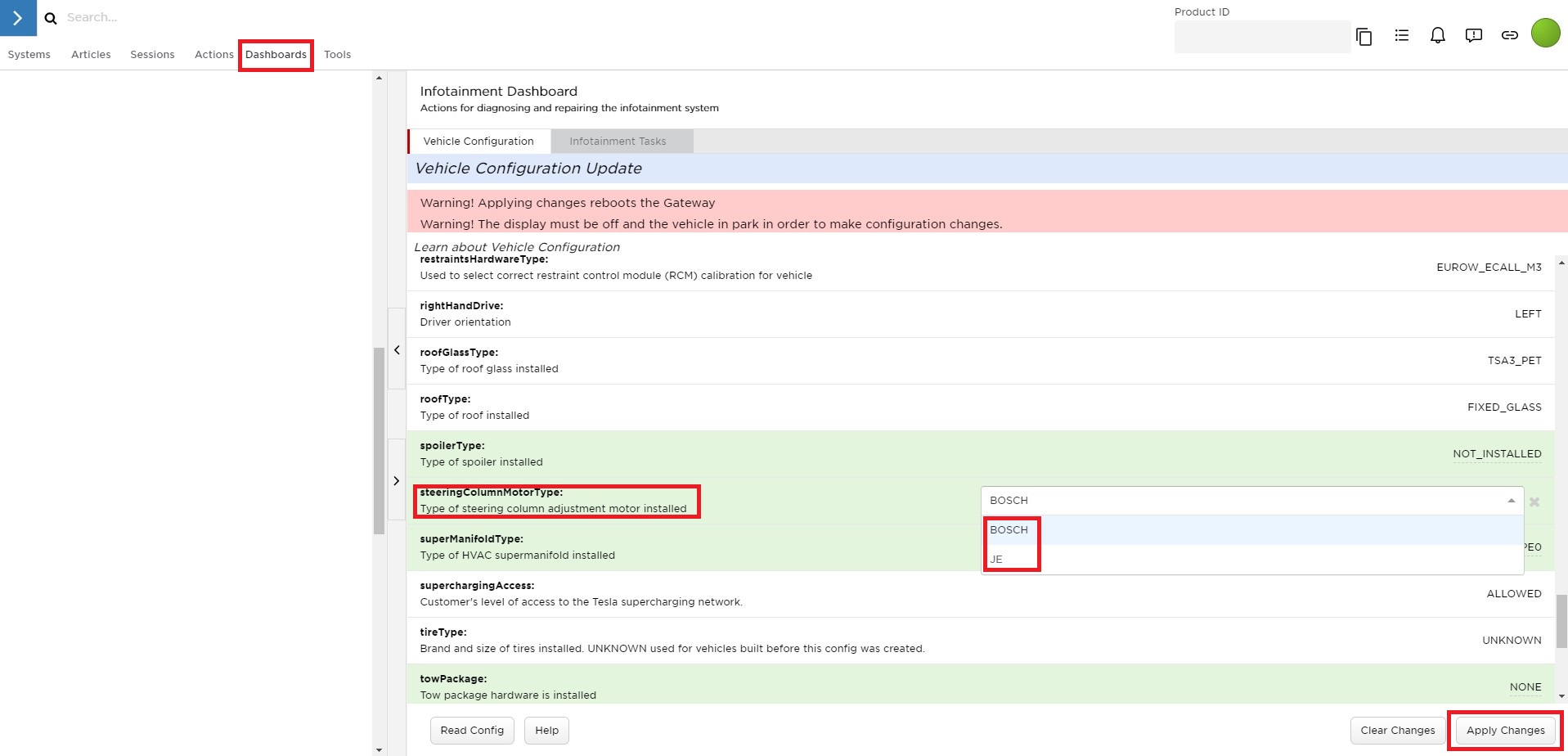 - 在 Toolbox 中,点击,点击Vehicle Configuration选项卡,将下拉菜单滑动至右侧steeringColumnMotorType,根据上表选择 “BOSCH” 或 “JE”,然后点击Apply Changes。