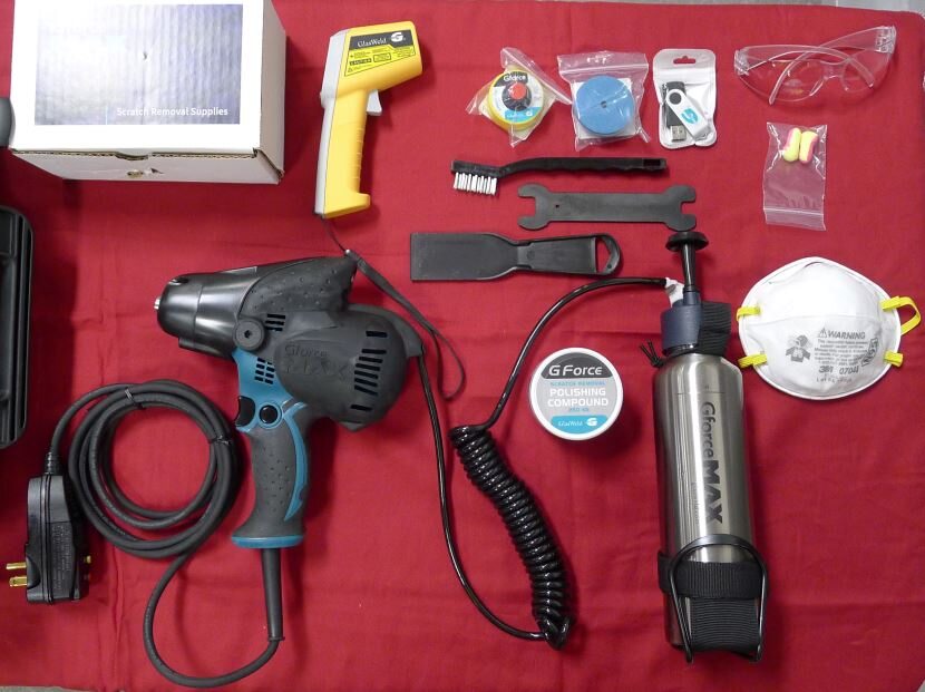 Inspect the glass scratch removal kit, ensure all tools are present, and then gather shop tools and PPE.
