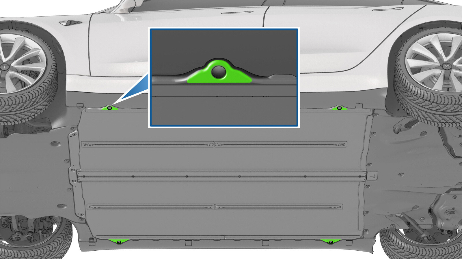 如图所示,将前后升降机臂垫板放置在高压电池上的车辆升降点上。