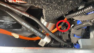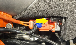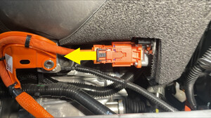 松开连接器锁,然后松开高压电池上的高压电池至空调压缩机高压线束连接。