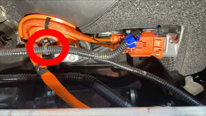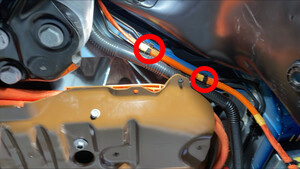 - 松开将高压电池至空调压缩机高压线束固定到高压电池后部的夹子(4 个)。