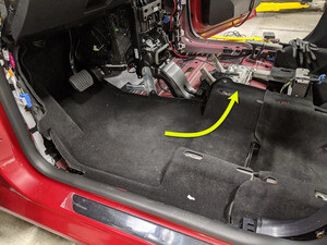 - Release the clip that attaches the LH front carpet to the body near the front of the LH door opening.