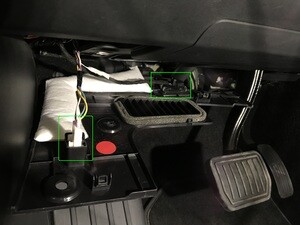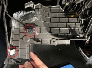 - Position the driver footwell cover into the vehicle, and then connect the connectors (x2) and then secure the tabs (x3).