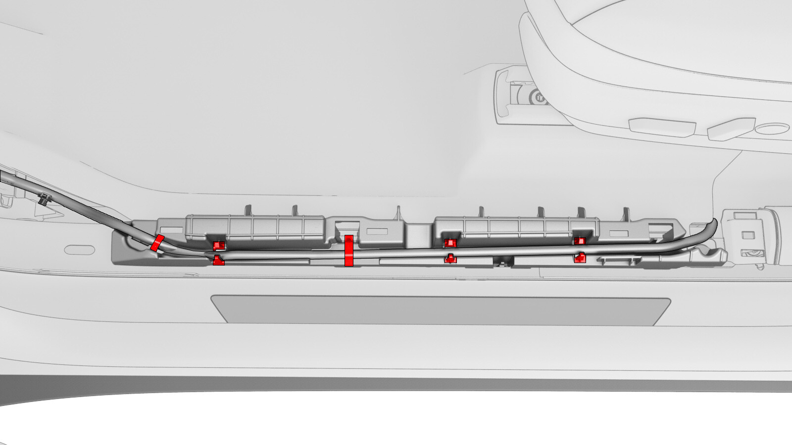- Route the 1st row LH seat harness under the LH front carpet, position the harness in the harness guide, and then install the clips that attach the harness to the harness guide.