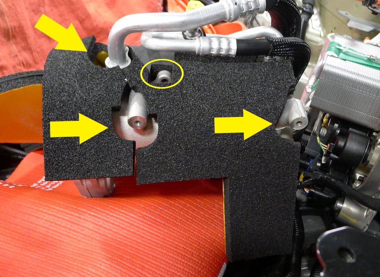 注确保高压线束支架与空调压缩机顶部的线束支座接合,如图所示。
