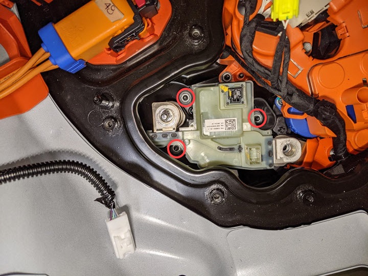 拆卸将高压电池负极触点开关固定到高压电池仓的螺母(2 个或 3 个),然后将触点开关从高压电池仓上拆下。