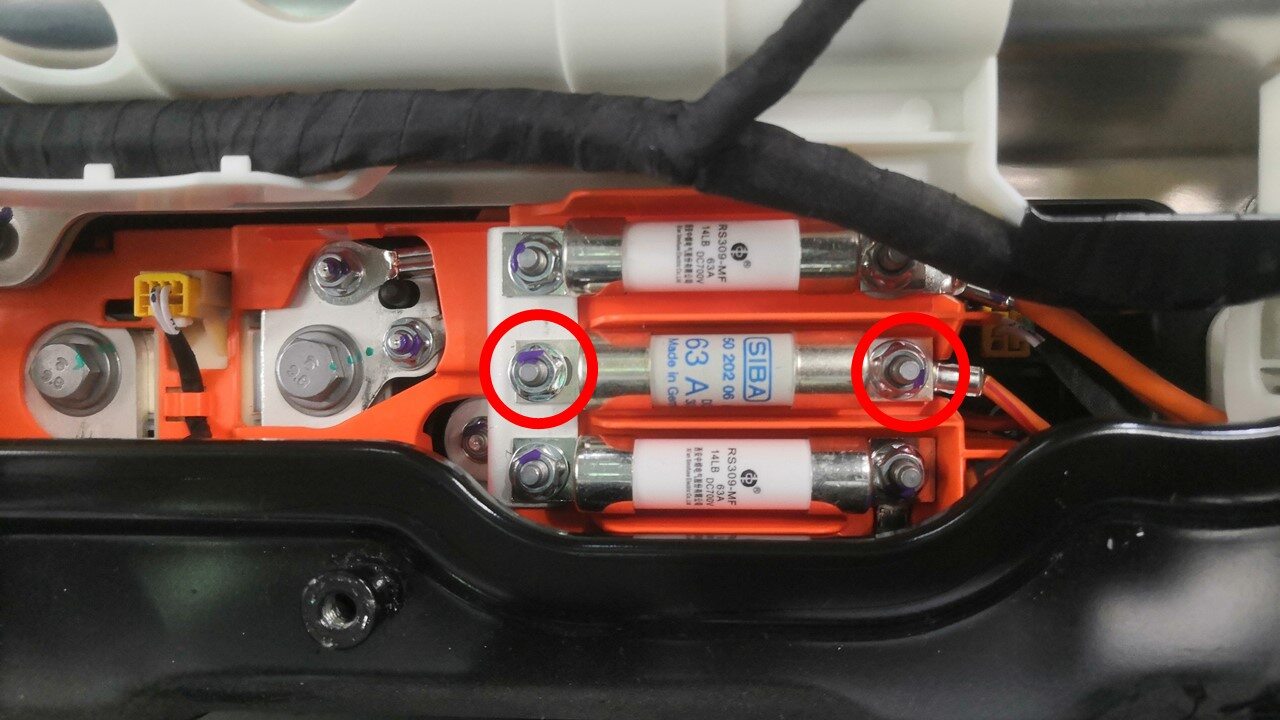 使用 Hioki 电阻计测量高压电池仓母排和功率转换系统保险丝主体左侧之间高压接头的电阻。