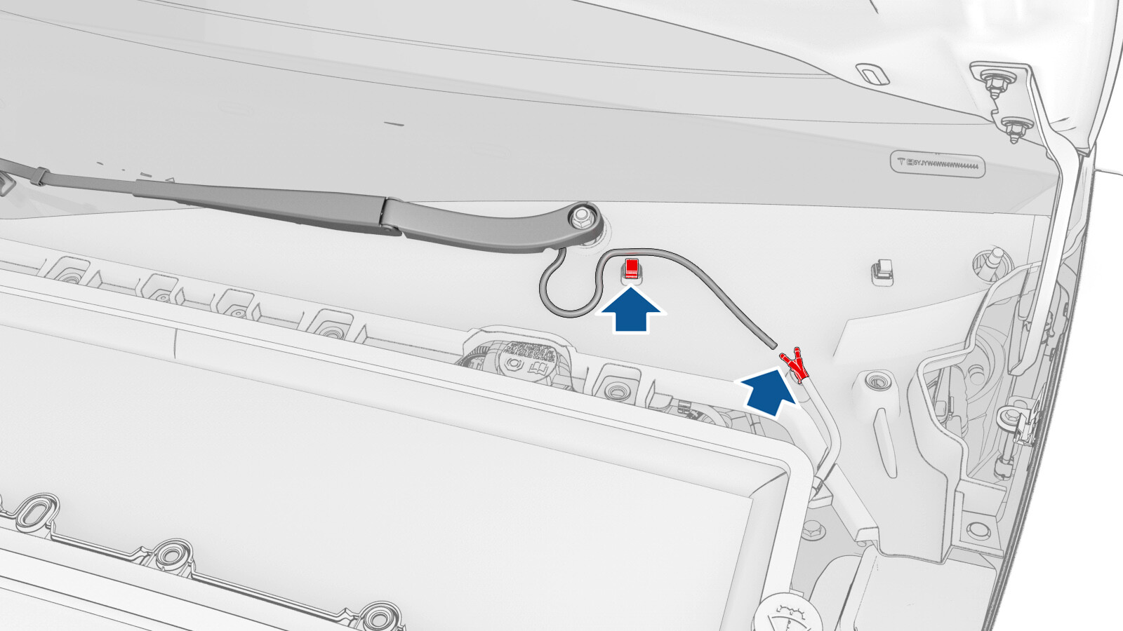 - 断开 RH 雨刮器臂软管与 Y 型管的连接,然后从夹子上松开软管。