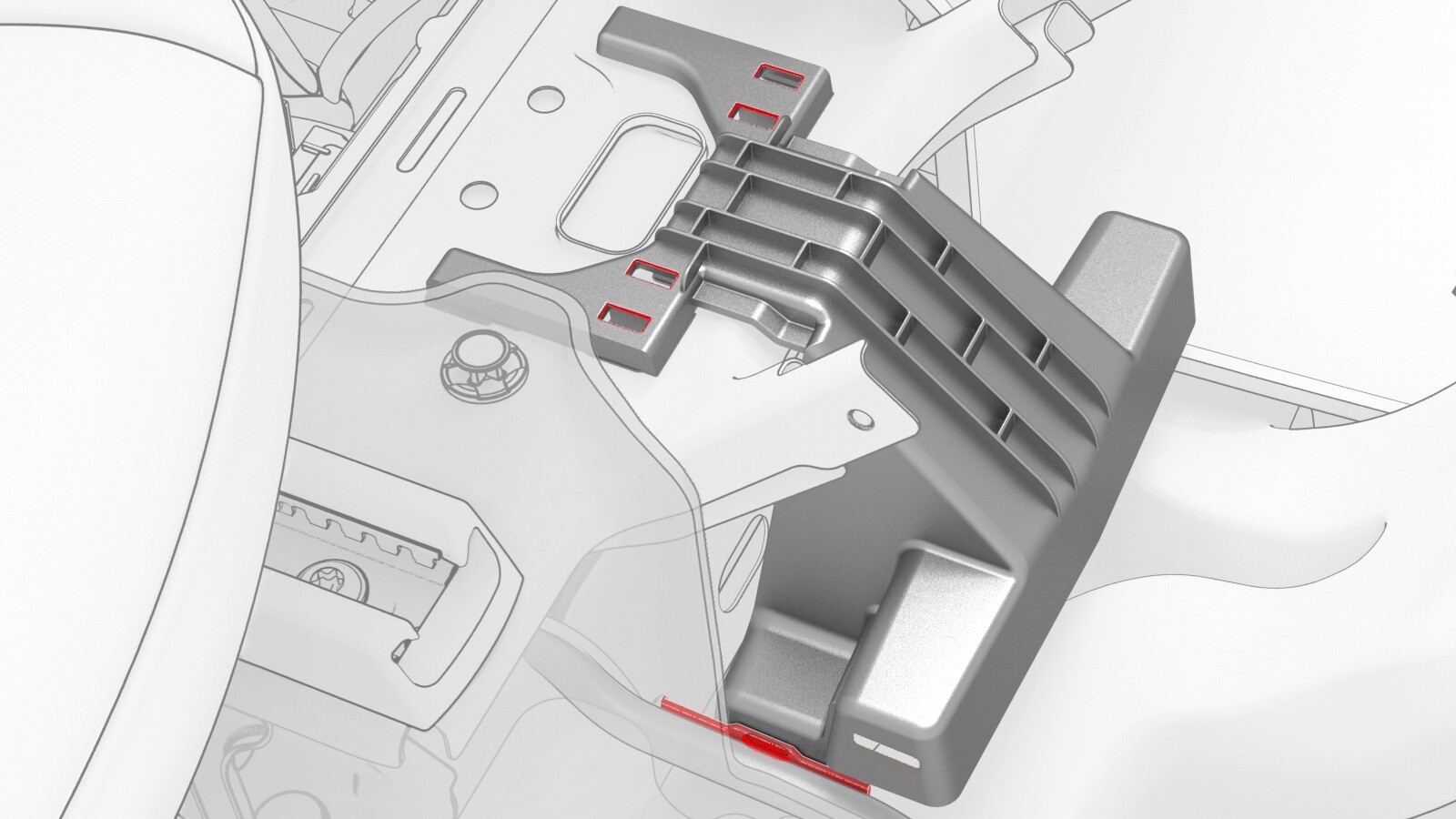 - 将中控台支架放置在车辆上,向后滑动支架,然后安装将支架固定到车辆的线束夹(1 个)和锁片(4 个)。