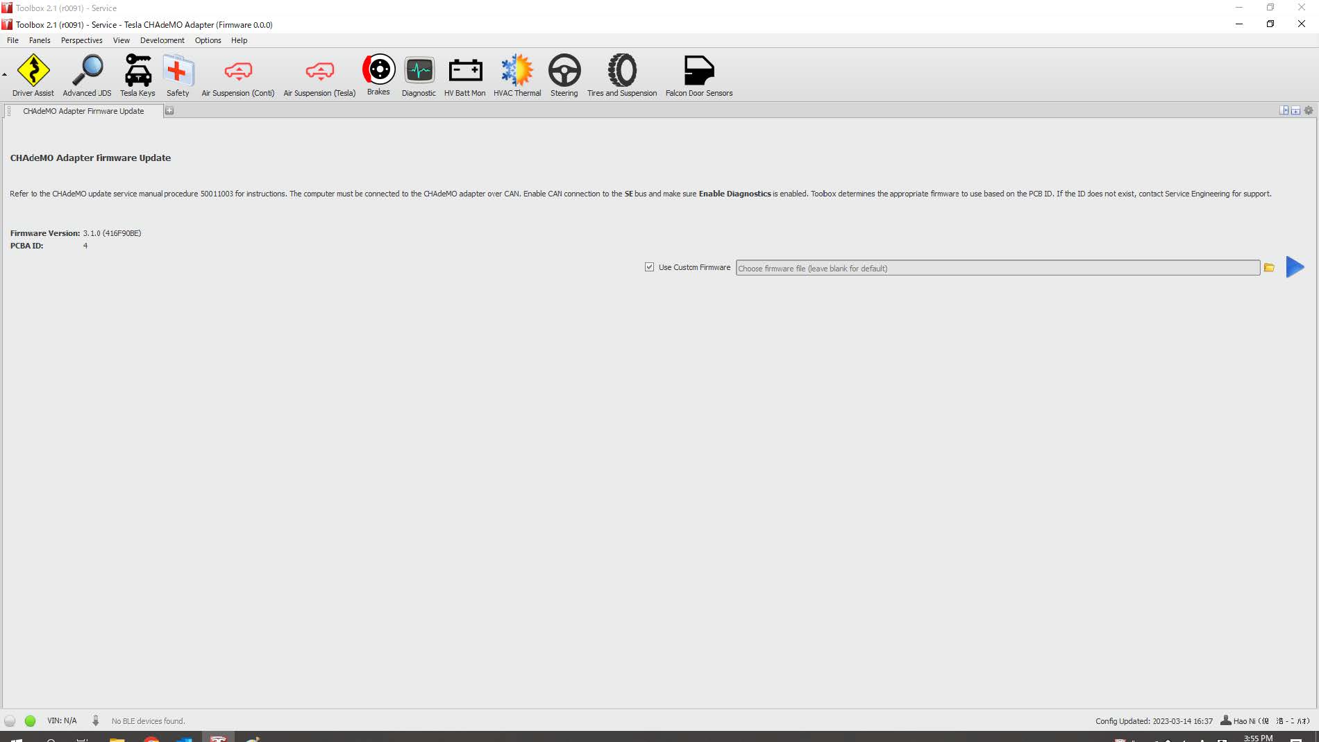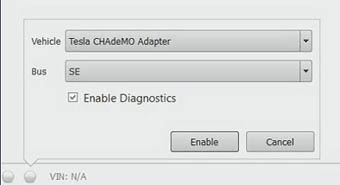 在打开的窗口中,在 “Vehicle” 下拉菜单中选择Tesla CHAdeMO Adapter,在 “Bus” 下拉菜单中选择 SE,选择Enable Diagnostics,然后点击Enable。