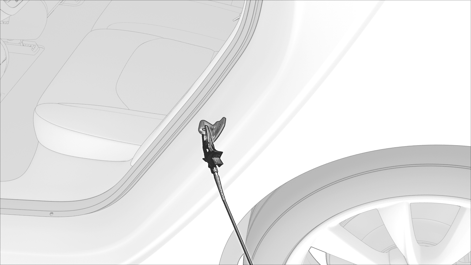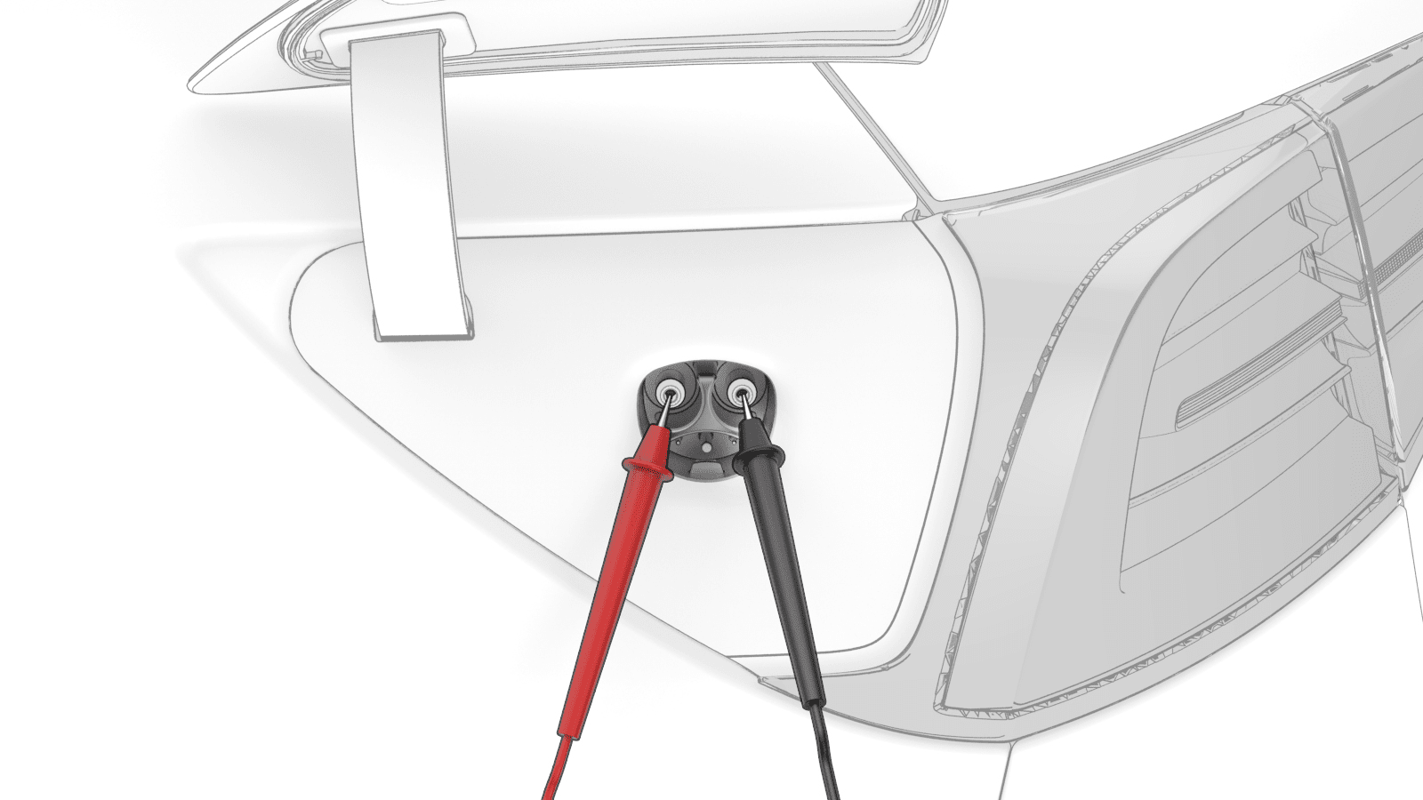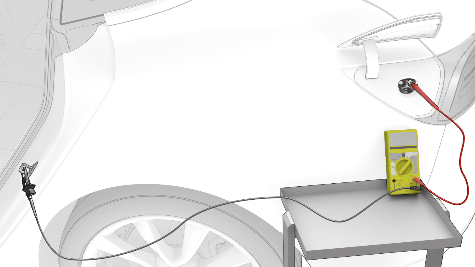 - 准备好万用表,将黑色鳄鱼夹固定到负极导线上,然后将鳄鱼夹接地到 LH 后车门闩锁撞销或掀背车门撞销上。