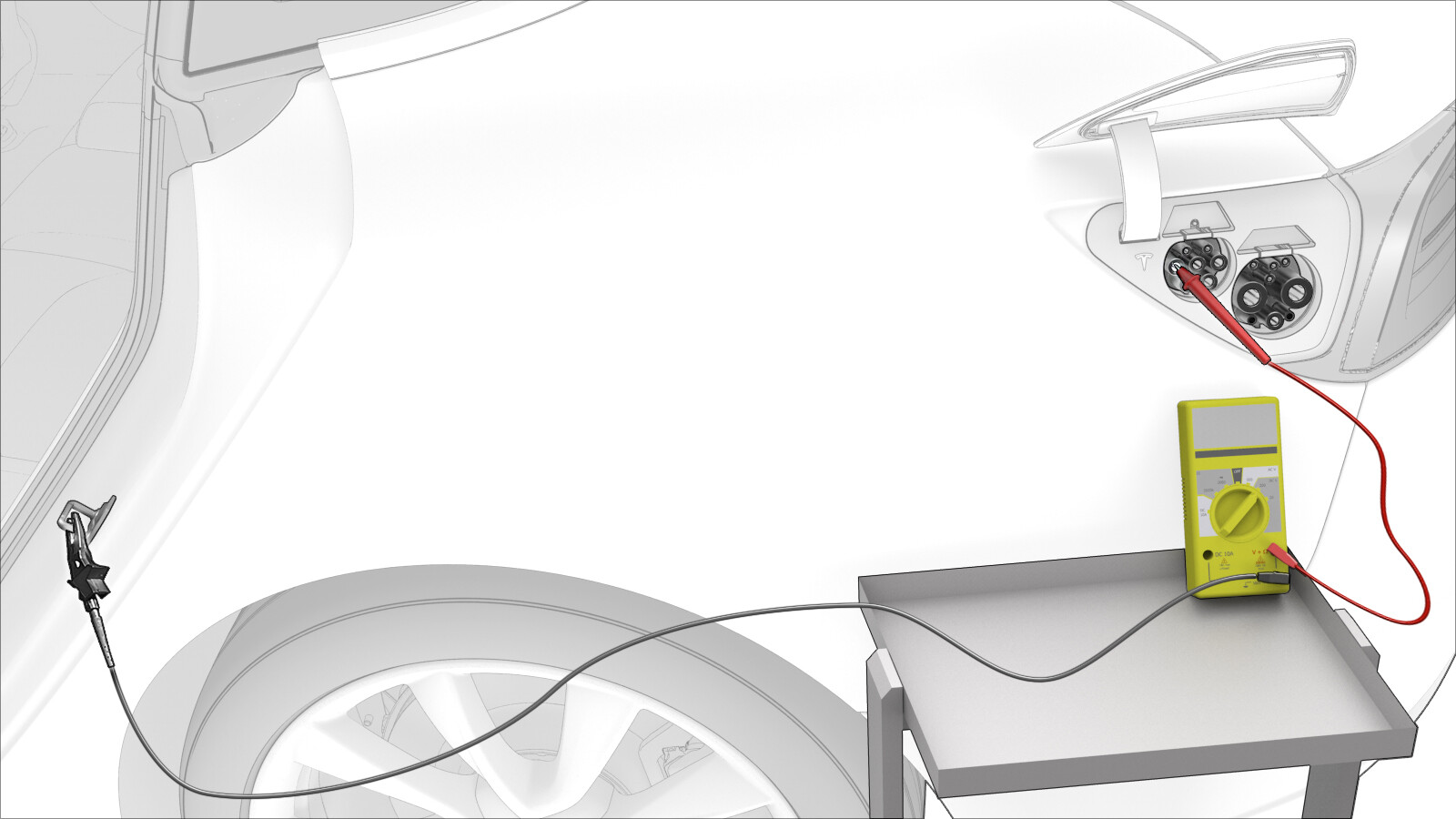 - 如果先前所有充电接口电压读数都小于 10V,则将万用表接地连接器从 LH 后车门闩锁撞销或掀背车门撞销上拆下,然后返回到说明如何检查充电接口电压的程序。