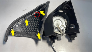将高频扬声器支架总成放置到高频扬声器盖板上,然后固定将盖板总成固定到支架的夹子 (x4)。