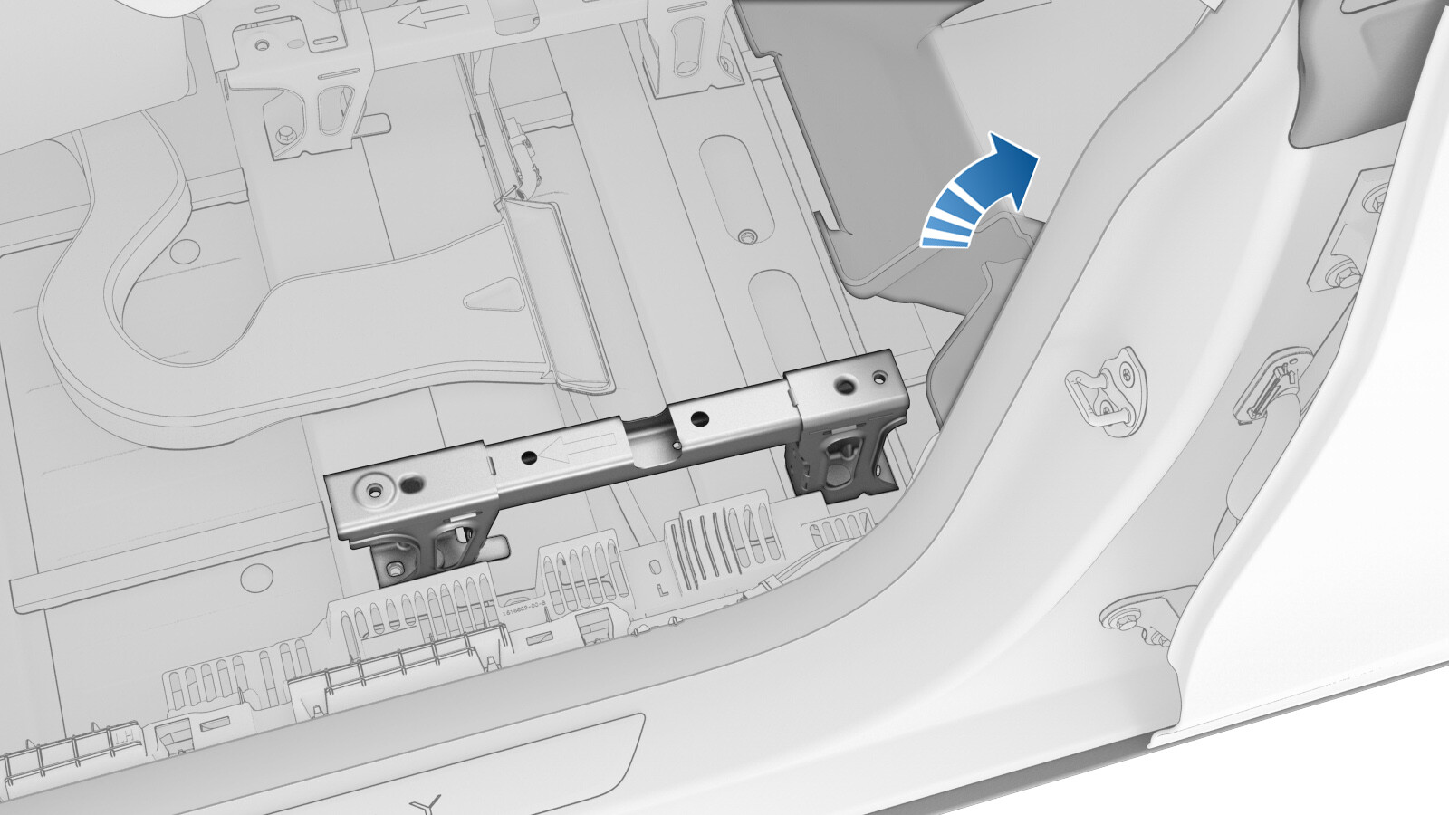 注在 LH 外侧座椅升降器后部附近抬起后部主毡毯的前边缘。
