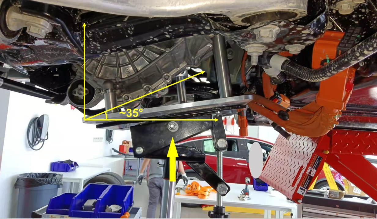降下前驱动单元,转动杆式千斤顶旋钮以将电机倾斜 ~35 度,将前驱动单元与副框架分离。