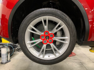 - 将轮毂千斤顶适配器安装到 LH 前轮毂上,然后用手拧紧轮毂螺母。