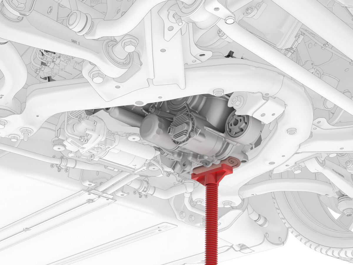 - 小心地降下前托臂支架,直至能触及前驱动单元机油泵。