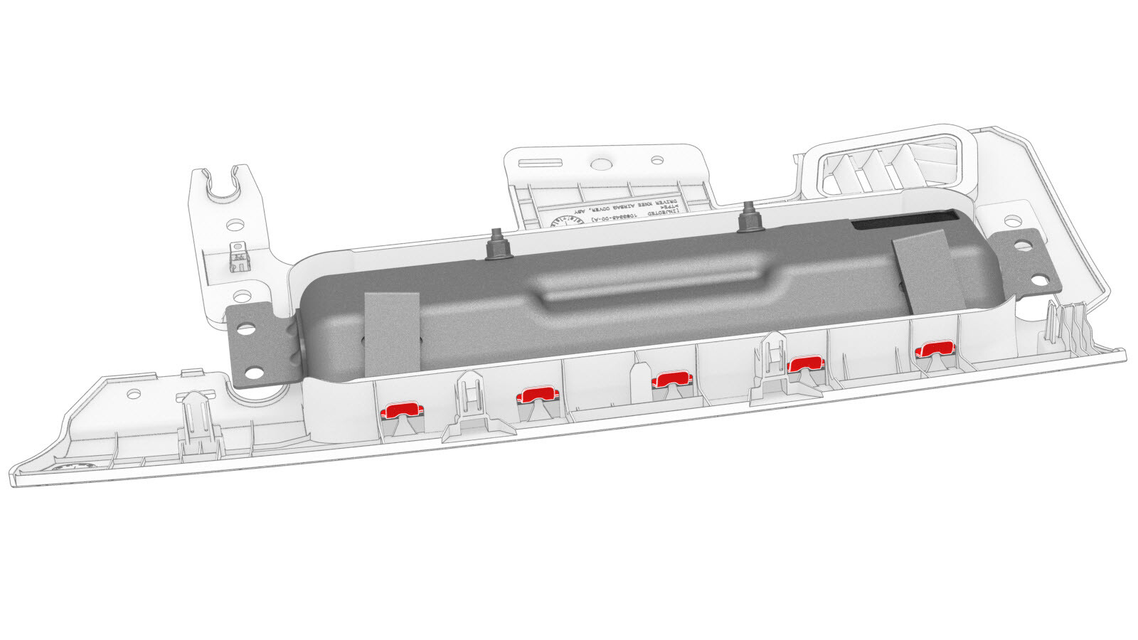 - 使用平头螺丝刀,沿气囊总成的后部边缘施加压力,执行此操作的同时,折曲膝部气囊罩壳四周,以松开罩壳四周 5 个气囊锁片中的每一个。