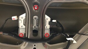 将收音机调谐器放置在掀背尾门总成上,然后安装将调谐器固定到掀背尾门的螺栓(3 个)。