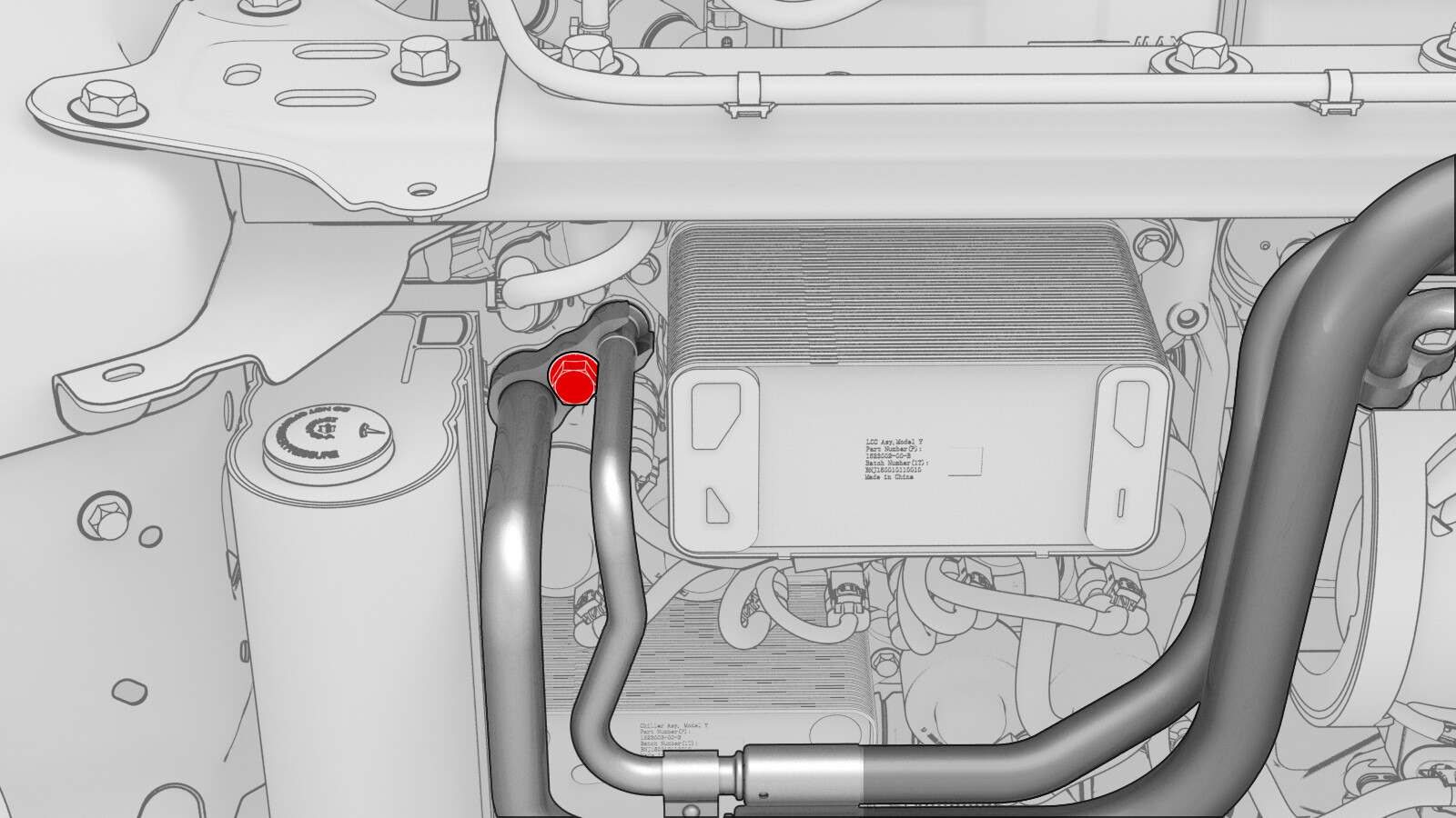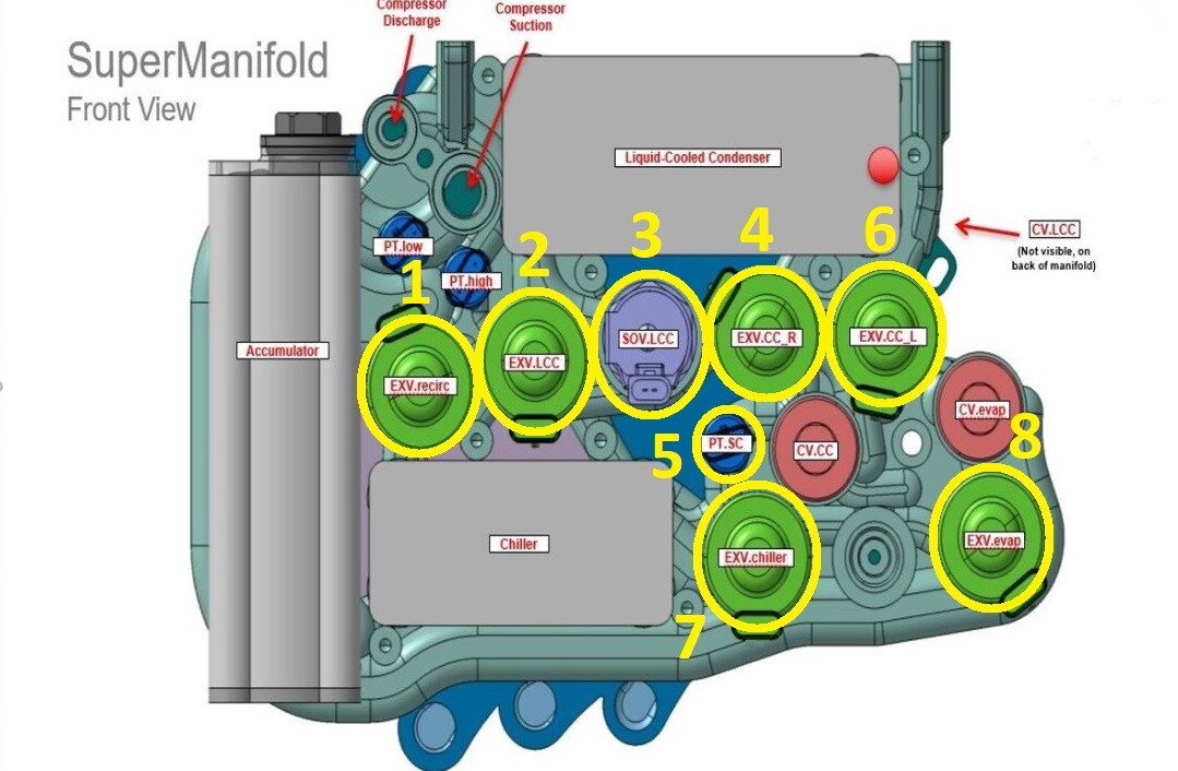 注完成后,点击右上角的 "X" 关闭窗口,Thermal Fluid Fill/Drain 例行程序的时间限制为 5 小时,5 小时后,膨胀阀将关闭,必须重新执行此例行程序,点击 Garage > Vitals > HP > Refrigerant Loop EXV 确认膨胀阀处于打开位置,确认液冷冷凝器、左侧 CC、蒸发器、右侧 CC 和冷却器均处于 ~100%。再循环处于 ~20% 状态,液冷冷凝器电磁阀处于打开状态 - 断开 12V 电源。请参阅12V/低压电源(断开和连接)。