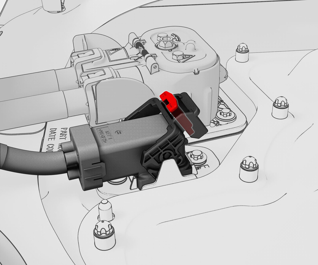 - 将交流线缆连接到高压电池仓高压接头,向下旋转黑色连杆,然后将红色锁片接合。