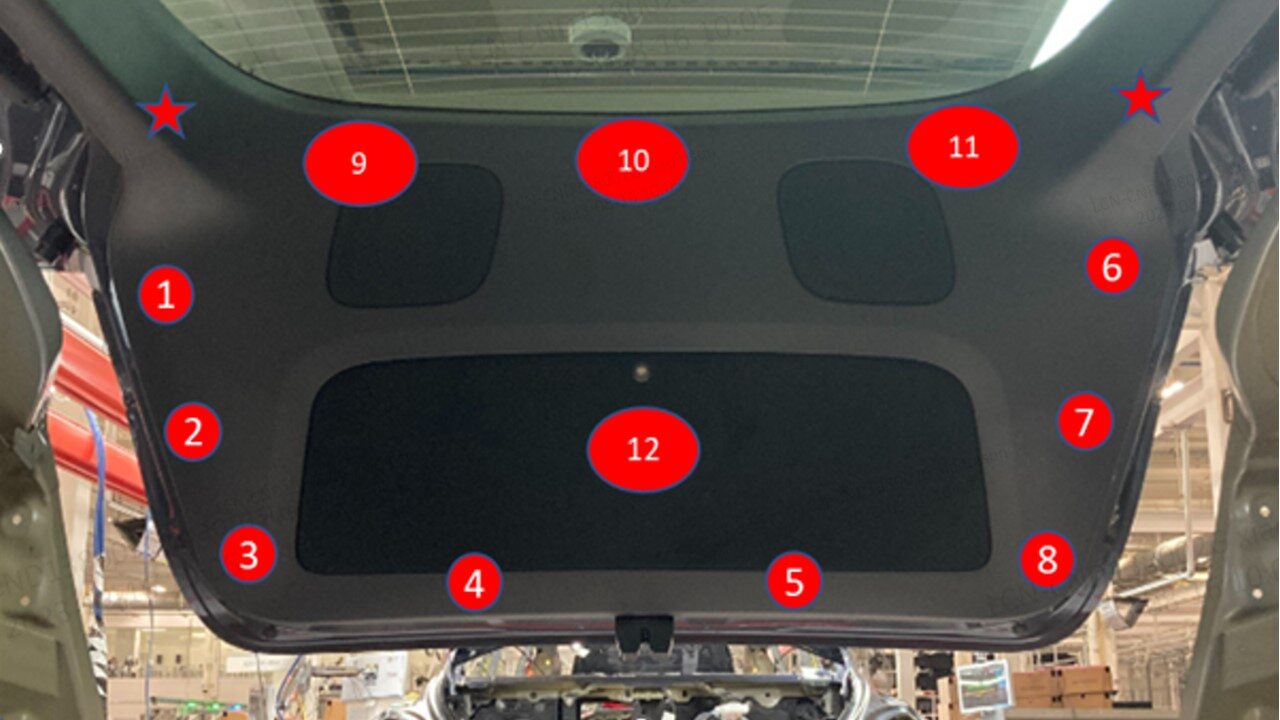 注可使用饰板工具或沙袋调整装配情况;打开掀背尾门前,先等待 10 分钟,使玻璃风干。请参阅面板定位规格了解最新规格。