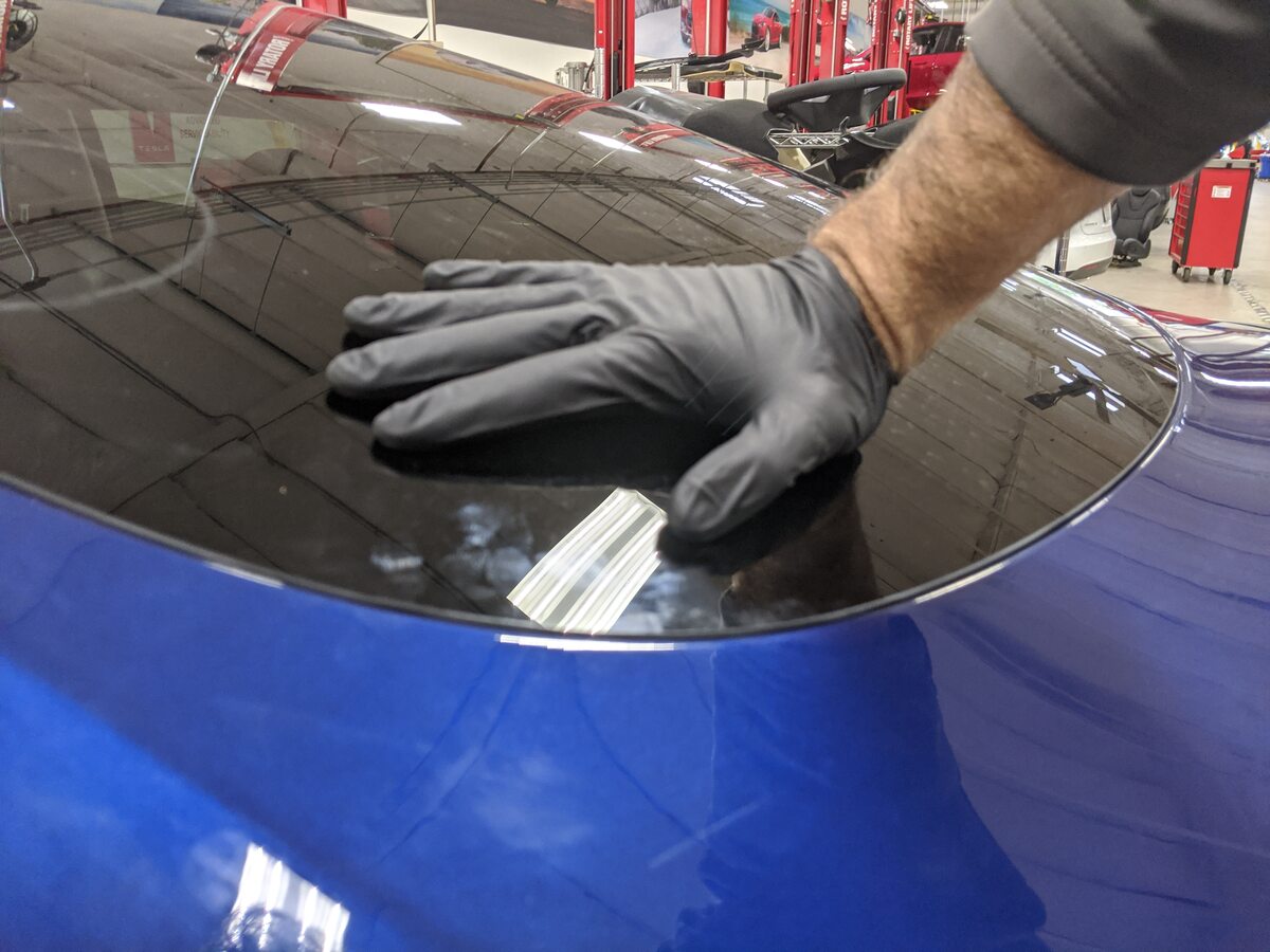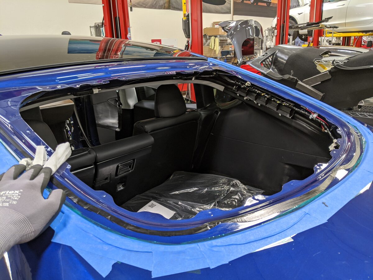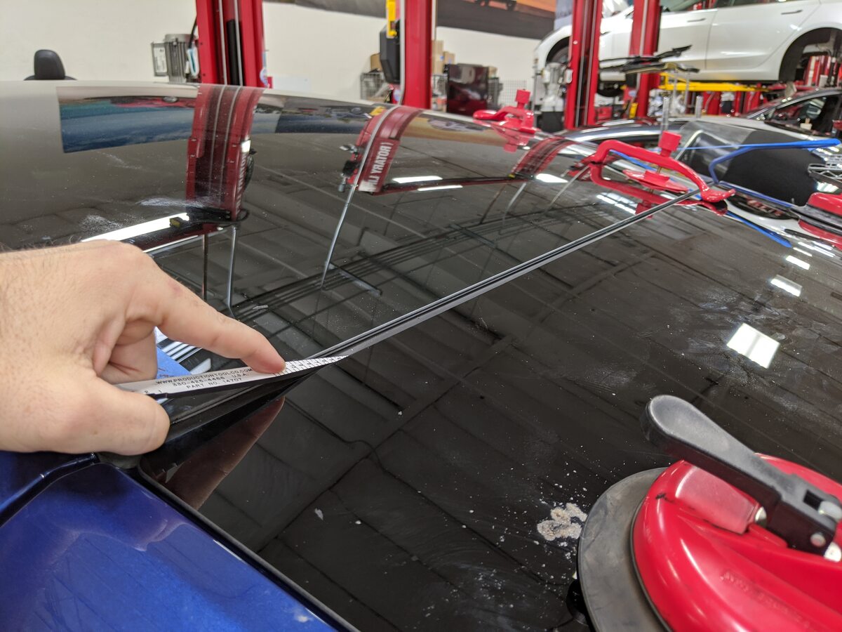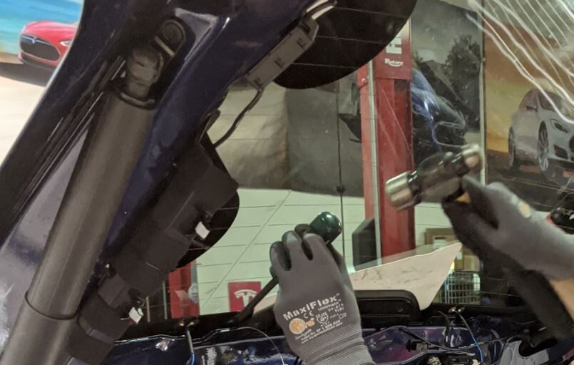 将工具插入后角处的车顶玻璃聚氨酯中。