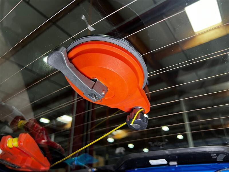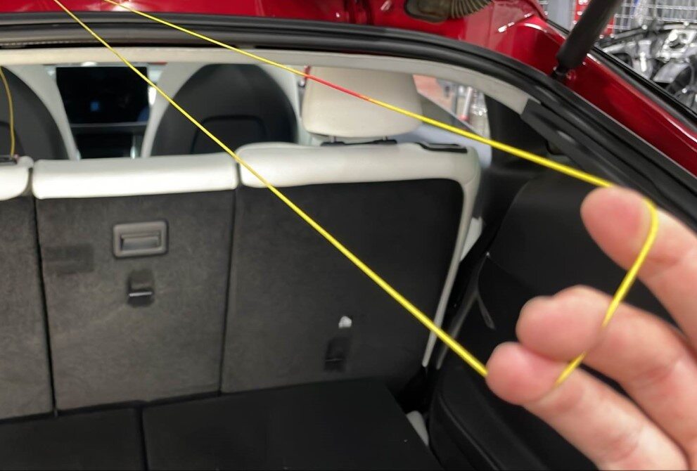 注确保拉出的绳子足够长,能够包裹玻璃四周;绳子两端可以留在车辆内部,无需完全穿过。