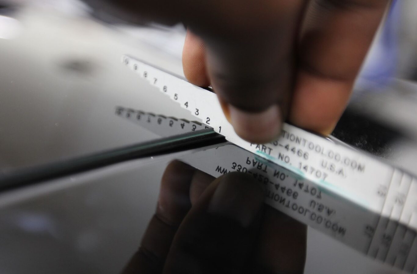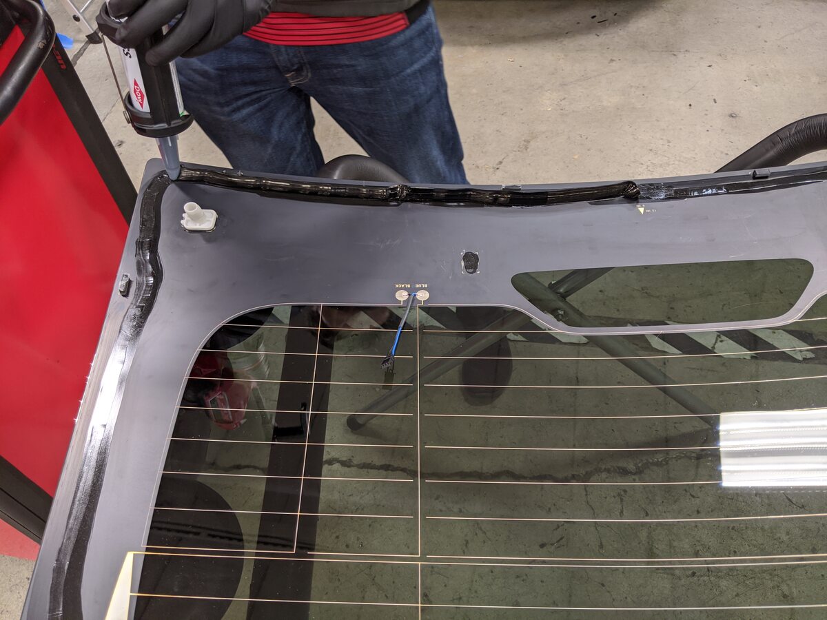 沿着底漆路径在背光灯玻璃上涂抹聚氨酯。