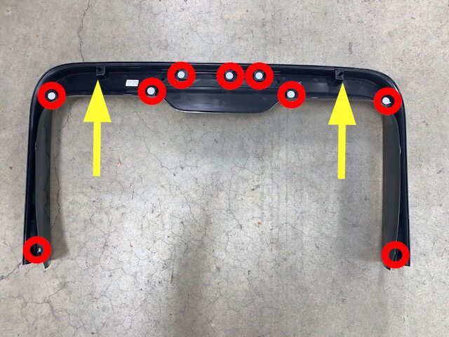 注2 个推拉式卡子,12 个卡子,6 个定位销,1 个连接器;如图所示,拆下两侧带星号的推拉式卡片,然后按顺序拆下饰板上的固定卡子。拆卸最后一个卡子时,用一只手握住饰板,以防其突然掉落并损坏连接器,请从左下角开始拆卸,以断开线束。