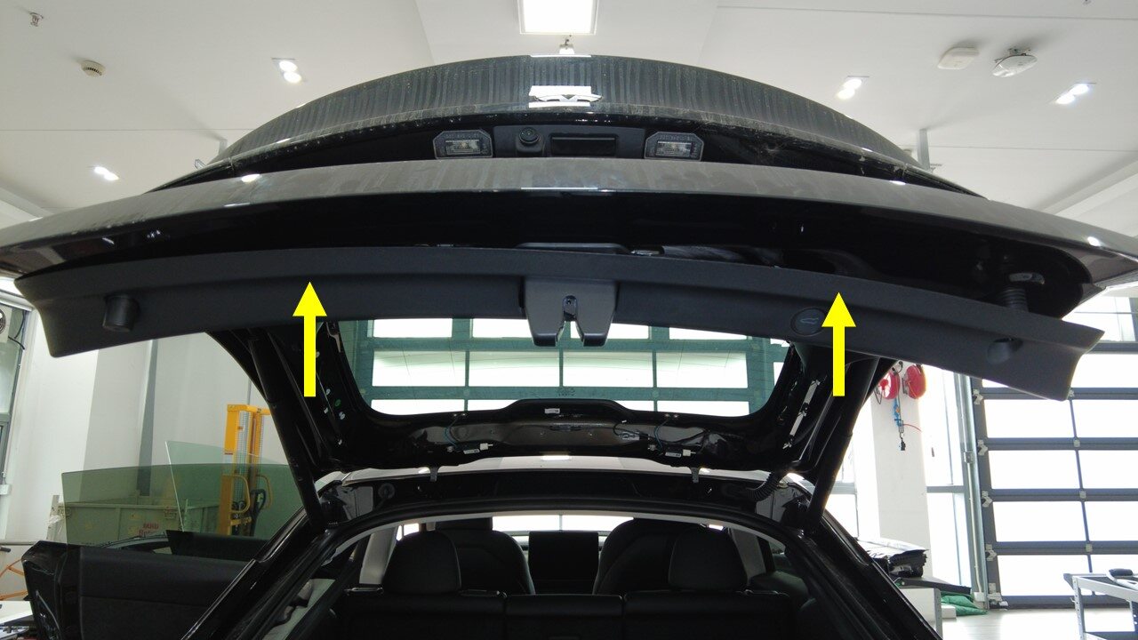注15 个卡子,2 个定位销,2 个锁片;先紧固上部,然后紧固侧面;确保锁片与掀背尾门下部饰板对齐。