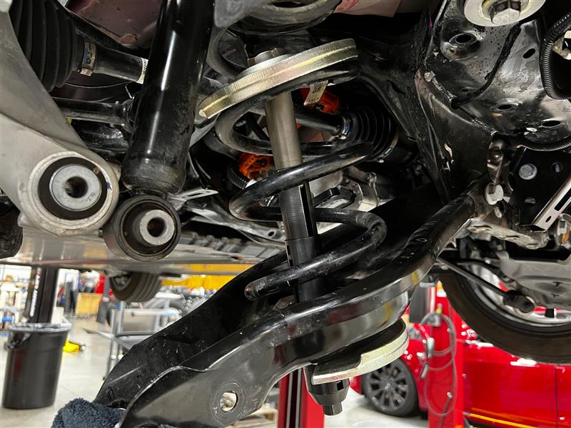 - 向左后弹簧上安装 Gedore 弹簧压缩器。