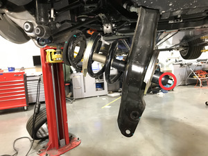 - 在协助下,降下支架,并在连杆向下摆动远离左后转向节时确保左后弹簧保留在左后下尾连杆上。