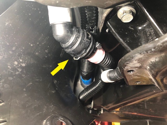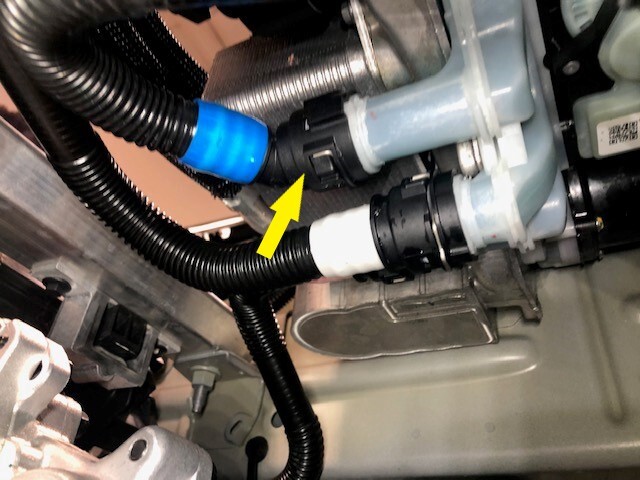 - 拆下夹子,断开动力总成旁路软管与超级歧管之间的连接,然后立即插入内外接头。