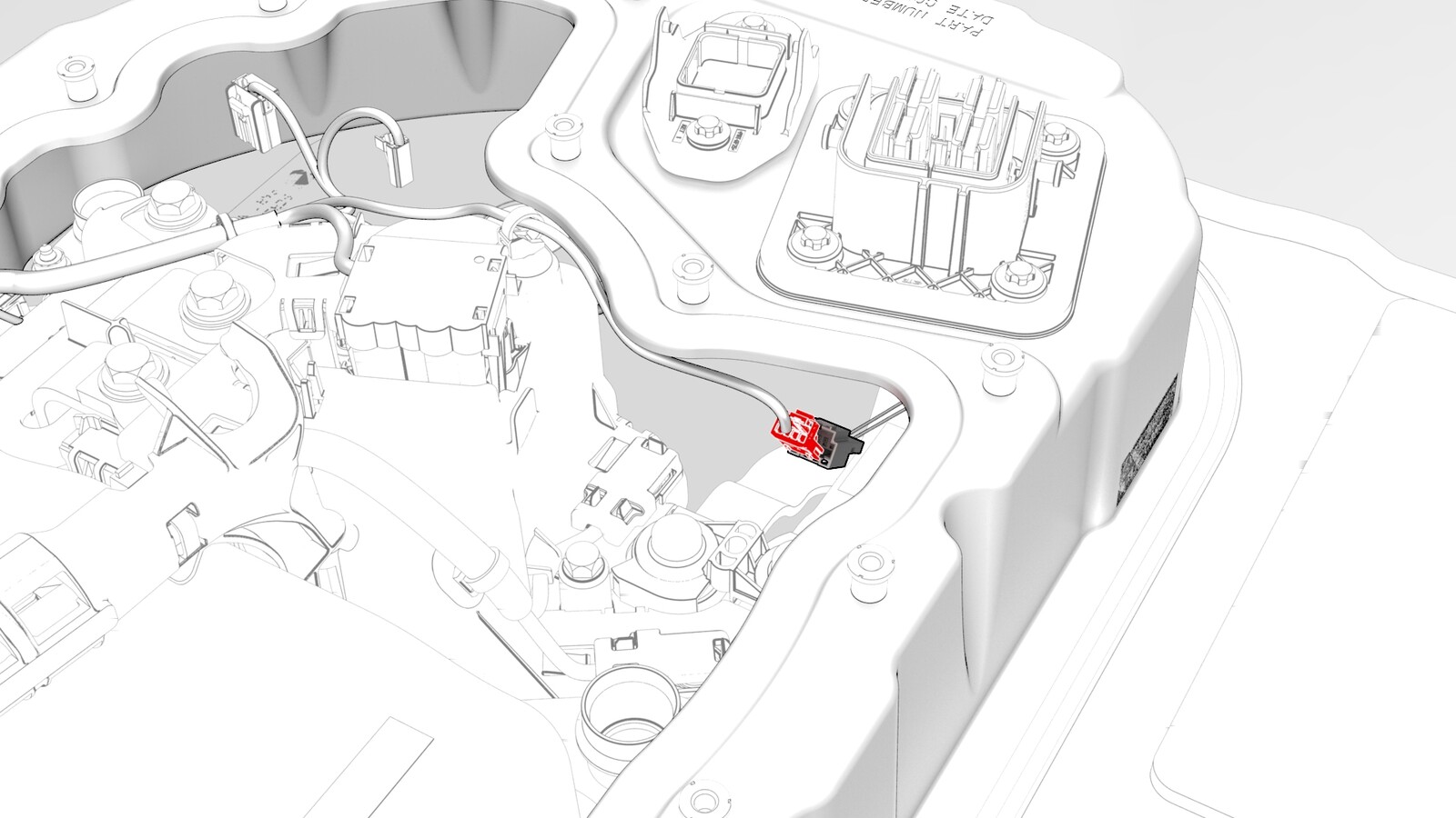 - 如果车辆装配双电机,请将高压电池高压电池仓线束连接到前驱动单元高压互锁回路连接器,然后紧固锁片下方的线束。