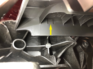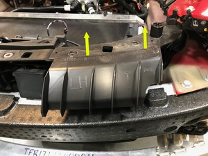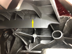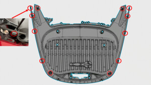 注1x tab, 2x datums, Release locking tab under fascia reinforcement, then pull straight up to release fascia reinforcement