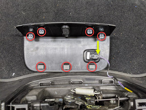 注4x clips, 1x connector, Frunk safety switch, 3x guide tabs, Grab closeout panel from bottom then pull it upward to release clips, Disconnect switch