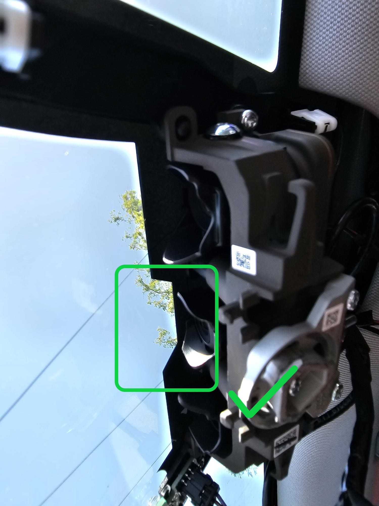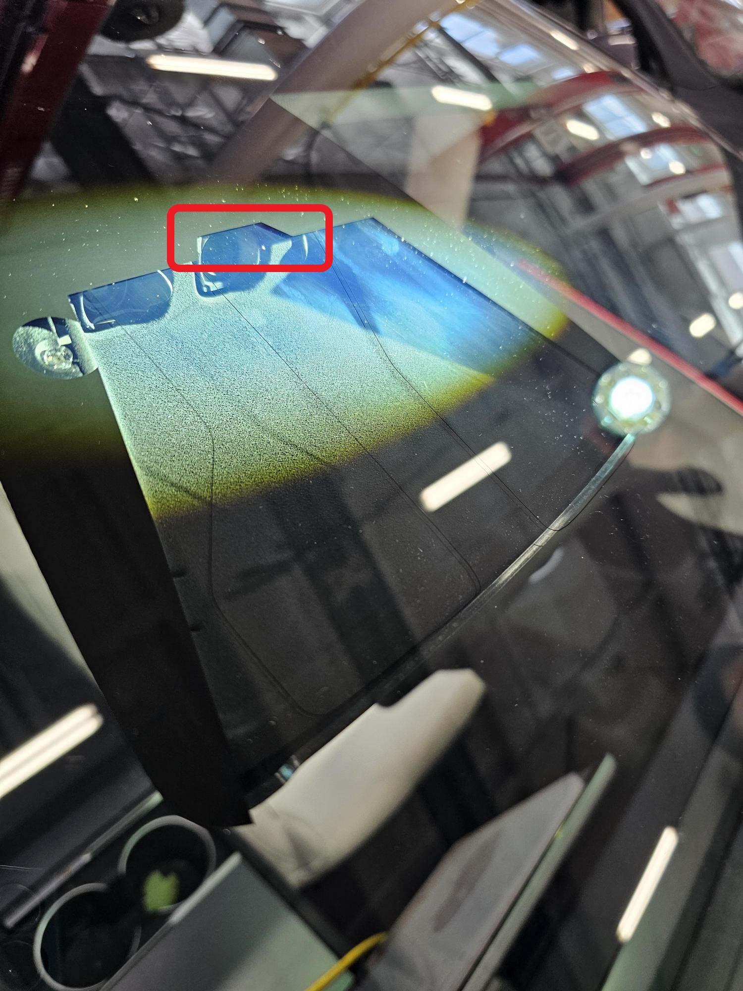 注请彻底清洁整个区域,包括所有边角。注对于 HW4 车辆,需特别注意确保凹槽干净(请参阅图片确认凹槽位置)。注清洁时,请使用摄像头预览功能确保毛巾直抵所有空腔,且摄像头正前方的玻璃清洁得当。 -