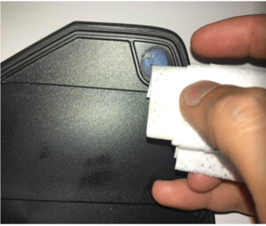 警告切勿尝试去除残留的粘合剂。不得向车门外表面涂抹异丙醇 (IPA),否则可能导致损坏。异丙醇 (IPA) 的使用量只需浸湿布料即可。应迅速完成擦拭动作,确保异丙醇 (IPA) 几秒钟即可从表面挥发。安装传感器目标前,应留出异丙醇 (IPA) 干燥时间。