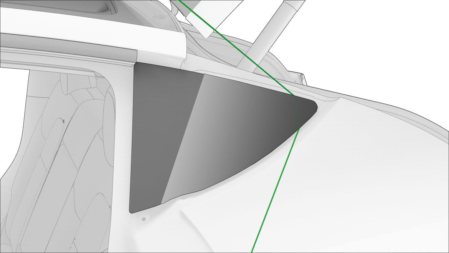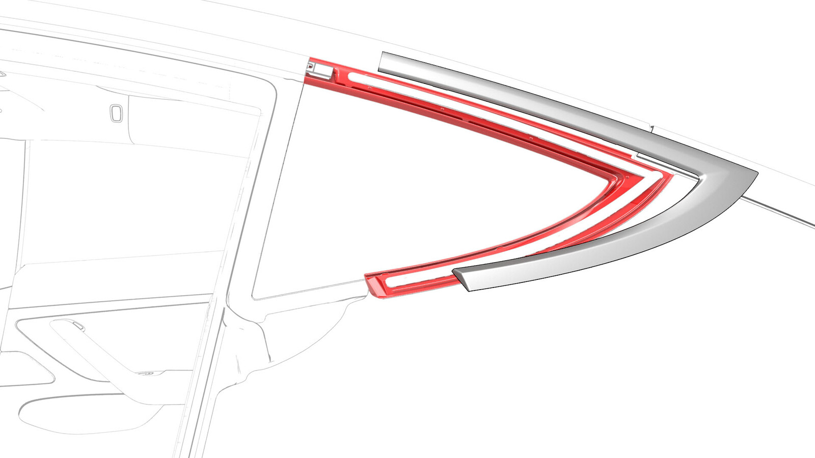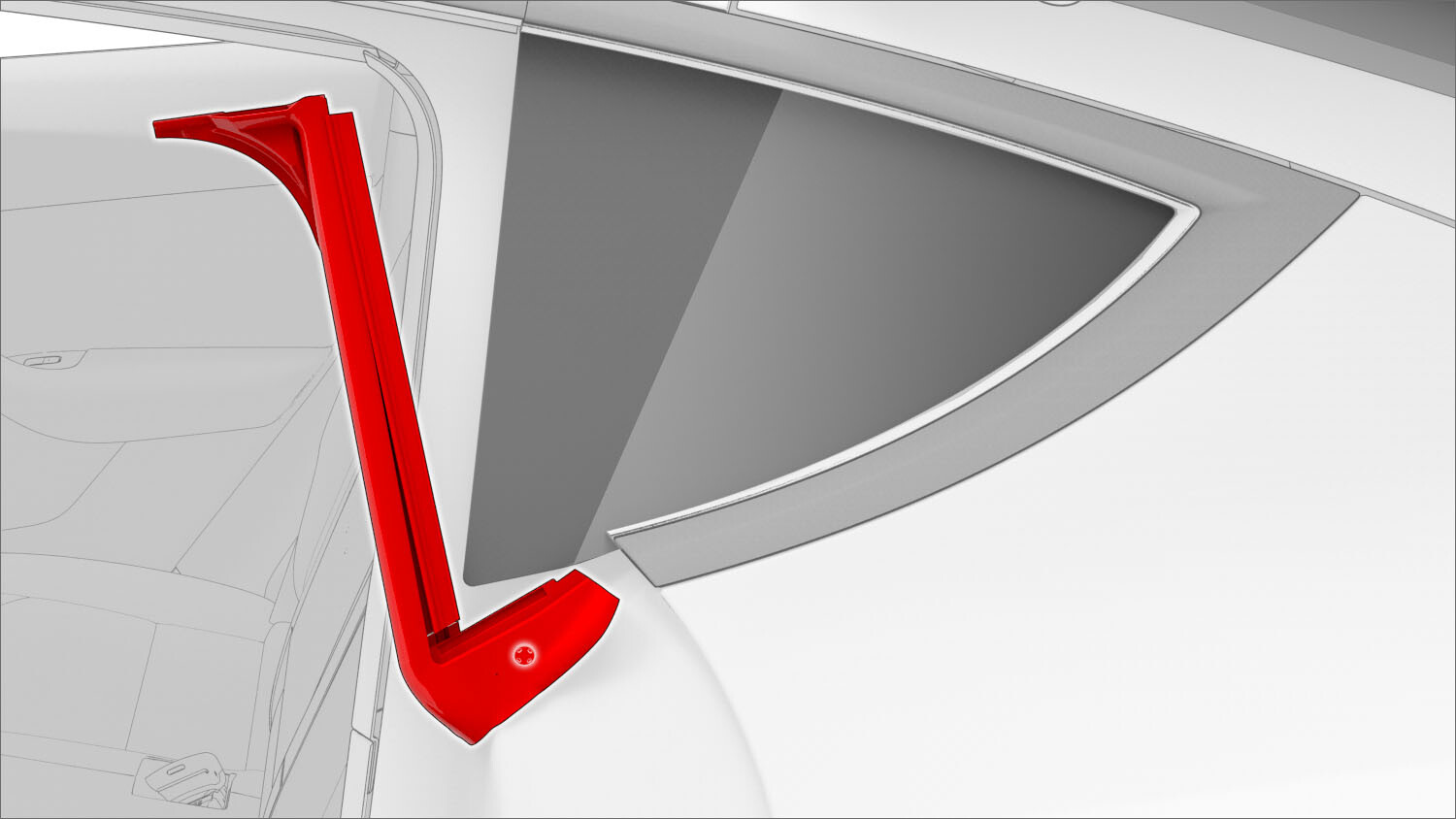 将 LH 后角窗玻璃放置在车身上,然后将后围亮条夹滑入顶部亮条。