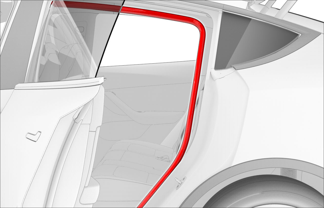 注确保 LH 后车门主密封条嵌在顶部亮条、LH 后角窗玻璃密封条和所有内饰上。