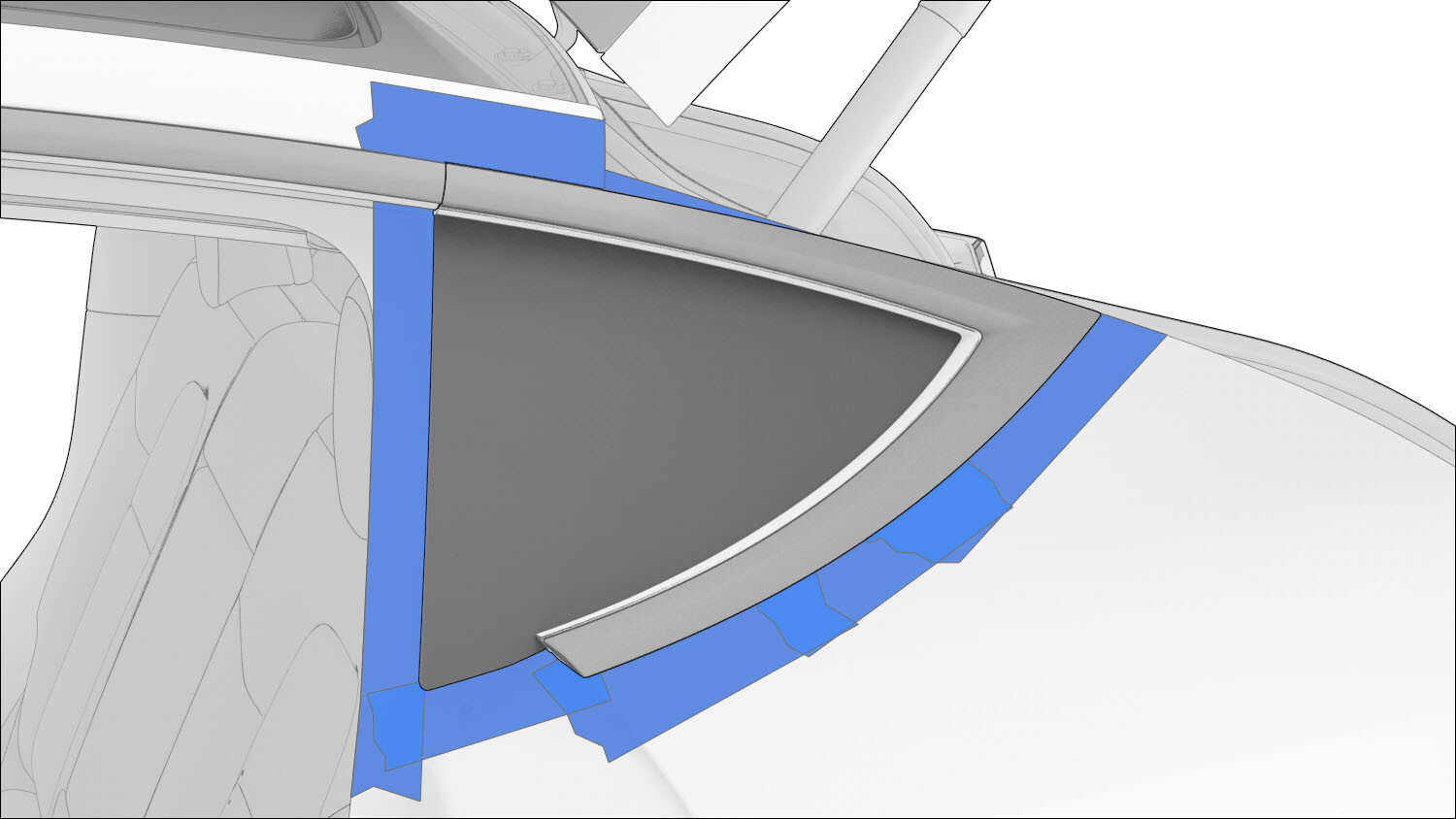 - 在等待聚氨酯固化的过程中,用胶带将 LH 角窗玻璃固定到车身上。