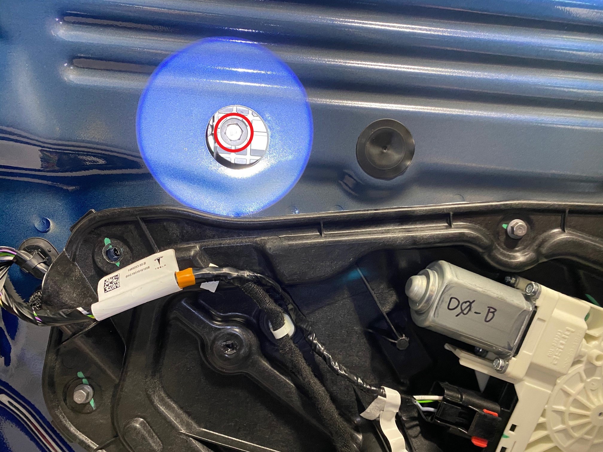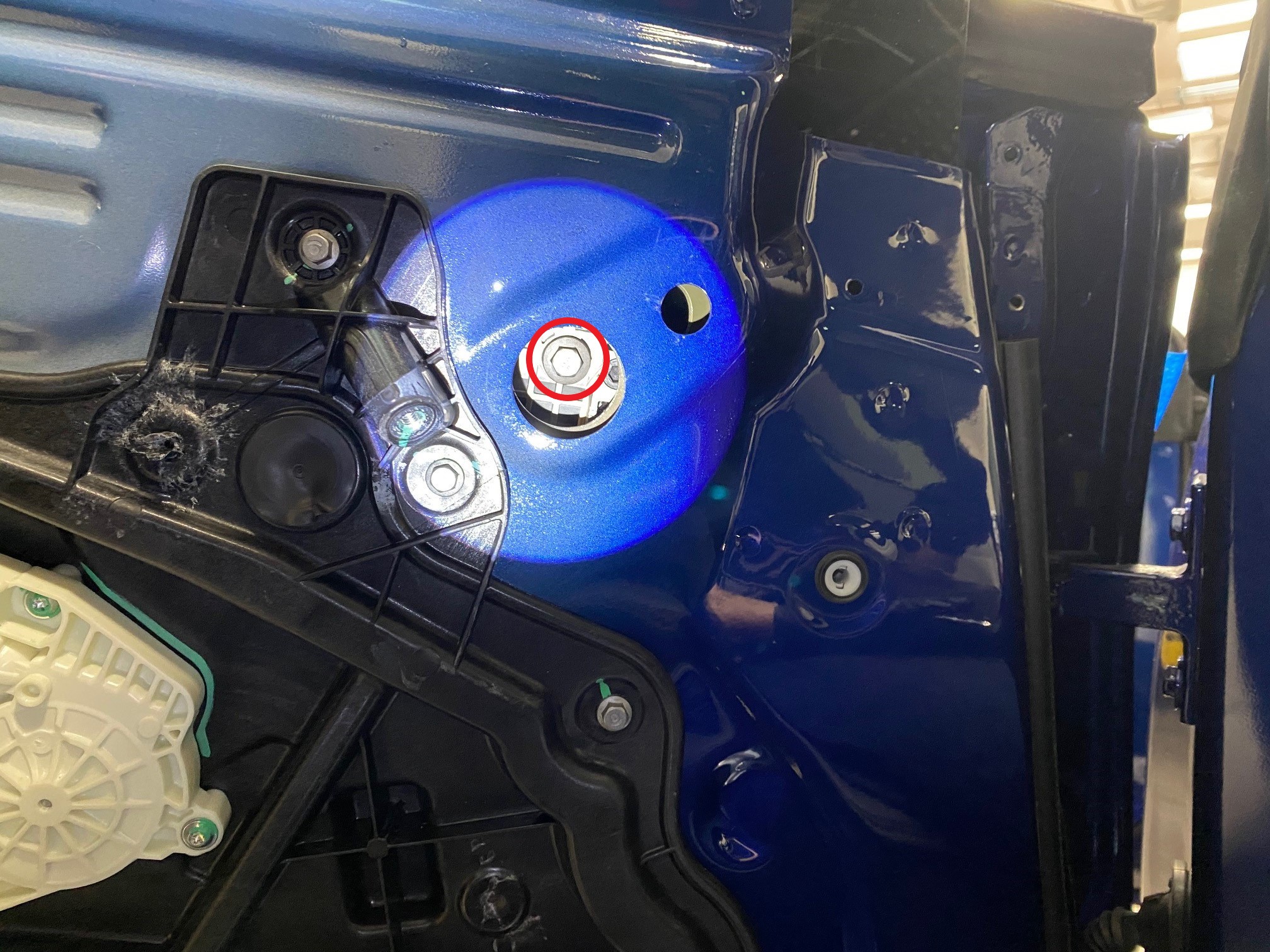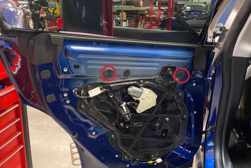 - 安装覆盖车门开口的螺塞(2 个),以便接触固定玻璃的紧固件。