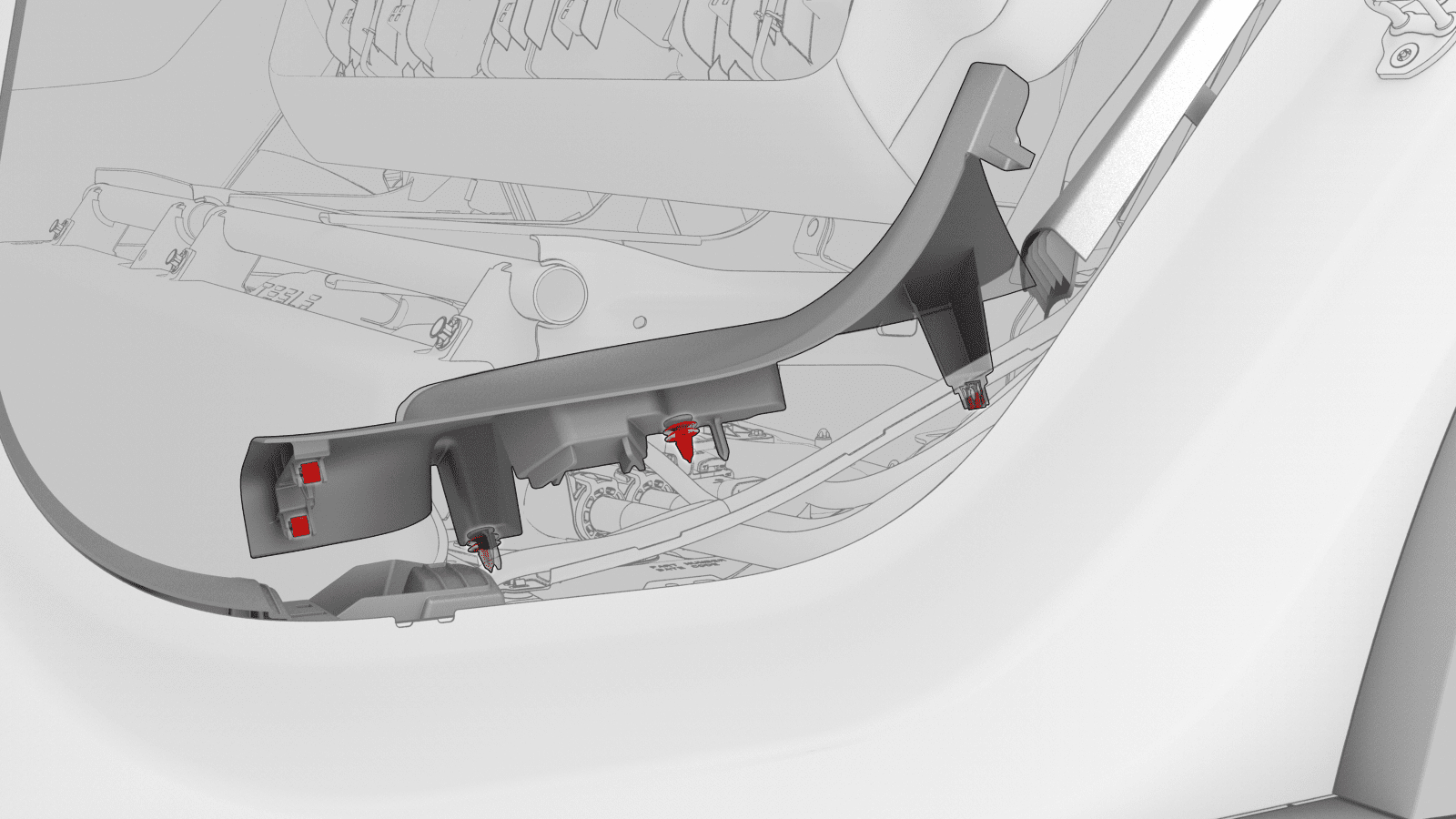 提示: 为便于稍后的安装,请记下 C 柱下部饰板与 LH 行李箱侧饰板结合的方式。提示: 从饰板前部开始向后,逐个松开夹子。注安装后执行推拉测试。不应在拆下支架后调整夹子位置,否则将导致支架无法正确就位。如果夹子位置发生变化或者推拉操作显示支架不牢固,则从锁片上拆下夹子,然后将夹子放入支架上的鼓形罩中并重新安装。