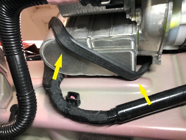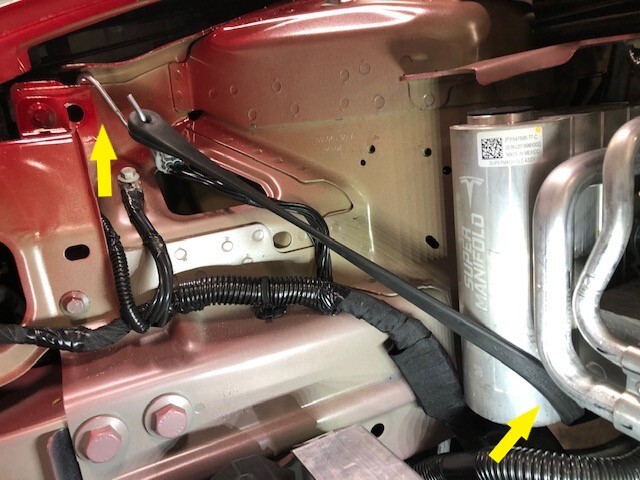 将弹力绳安装到 RH 前备箱盖支柱支架上。将弹力绳环绕在蓄压器外壳周围,并固定到车身 RH 侧。切勿将弹力绳固定在冷却液泵或超级歧管塑料外壳周围。必要时使用镜子目视检查蓄压器外壳周围的弹力绳。