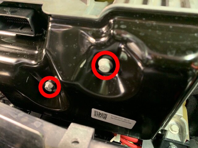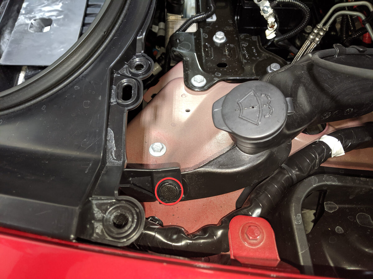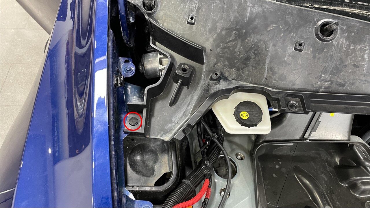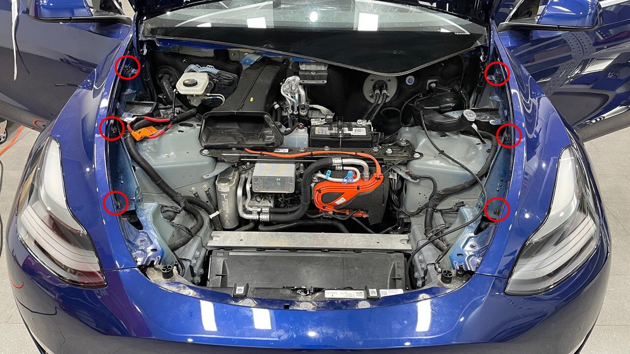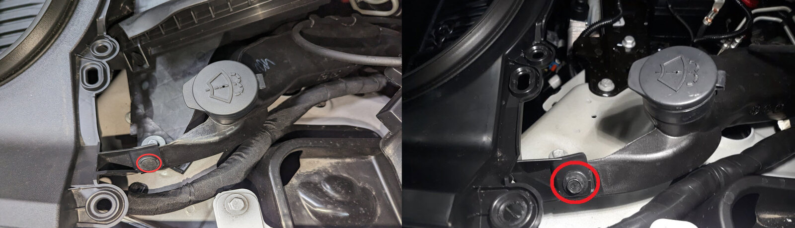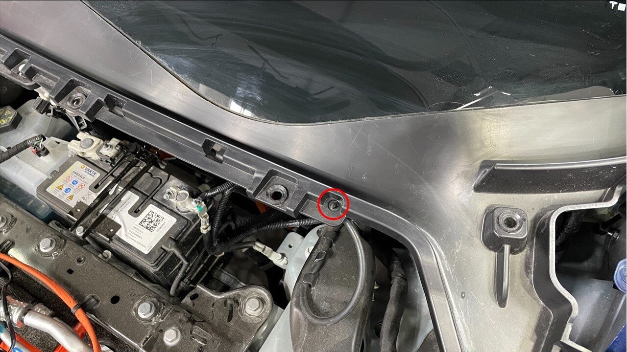 注5x bolts, 10mm, 5 Nm, Newer vehicles may be equipped with 4x bolts and 1x push clip securing frunk to reservoir neck